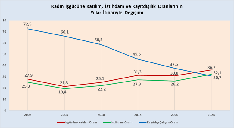 2002 yılında kadınların işgücüne katılım oranı %27,9 iken 2025 yılında %36,2’ye yükselirken, aynı dönem için kadın istihdam oranı %25,3’den %32,1’e çıkmış ve kayıt dışı çalışan kadın oranı ise %72,5’den %30,7’ye gerilemiştir.